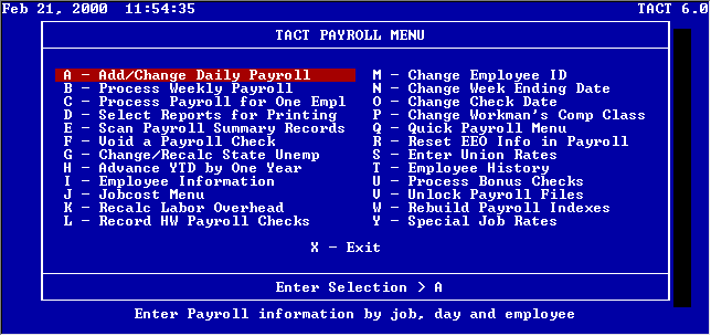 Payroll is designed for either daily or weekly data entry, by employee or by job - whichever way works best for you. And all of the unusual circumstances that can arise when doing payroll are handled for you - lay-off checks, bonus checks, handwritten checks, unemployment and worker's compensation changes, errors in data entry, anything you can think of, TACT has a way of handling it with ease.