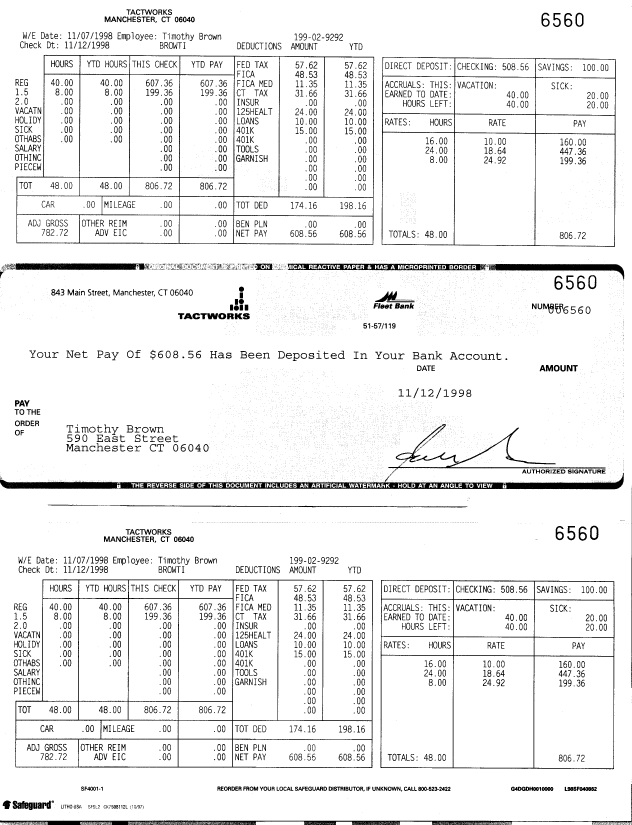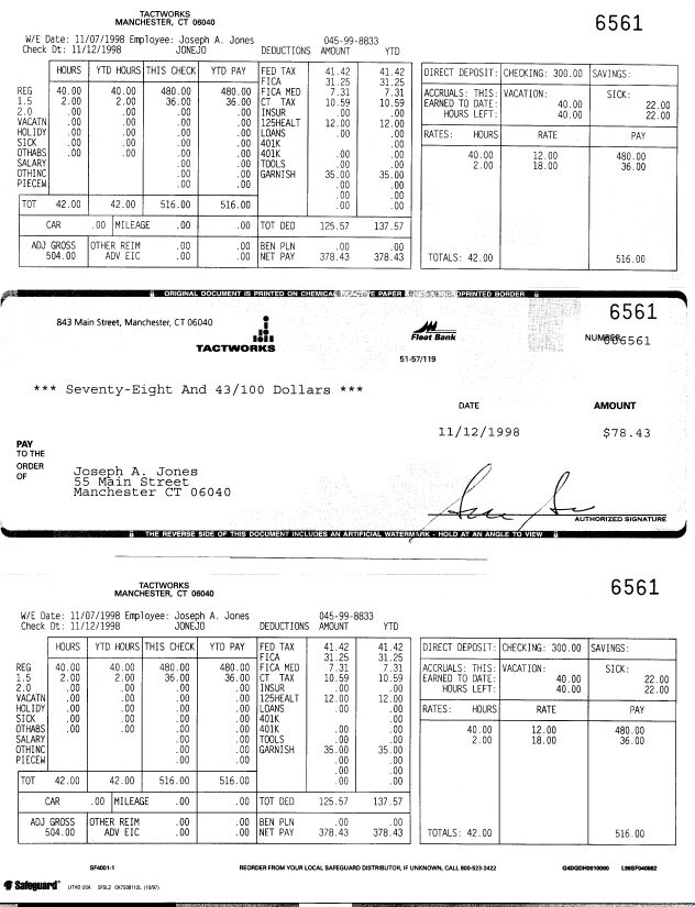 This selection is used to print new payroll checks. You are prompted for the next check number to print. All information about this check and year-to-date for all earnings and deductions are shown on the pay stub. Both laser and dot-matrix formats are available.