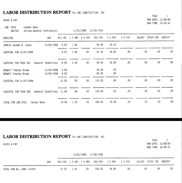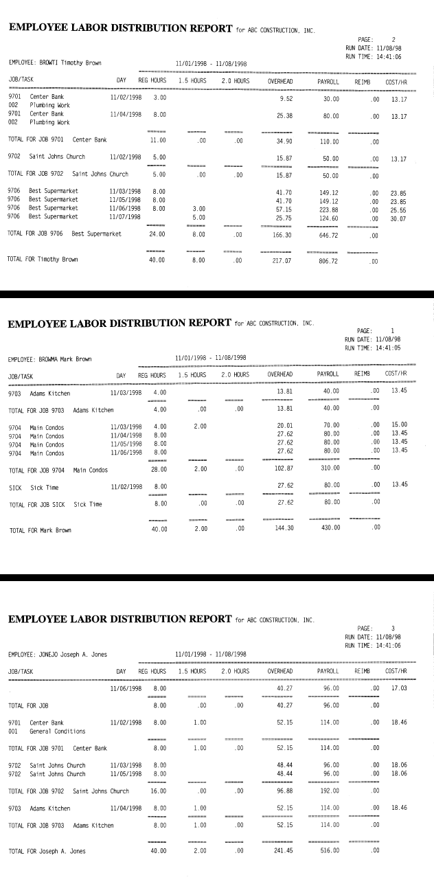These reports show the detail of hours, pay and overhead by employee and job. There are several formats to choose from depending on what you wish to see. They may be printed for any jobs for any dates. They may also be printed by employee and may be sorted by job, date or employee.
