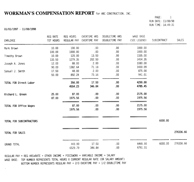 This report is used for Worker’s compensation audits. It can be printed for any range of dates and breaks down all the payroll by worker’s comp class. It also shows the total subcontractor bills and sales. Worker’s comp class can be changed at any time and this report can be reprinted.