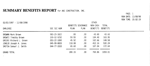 This report can be printed for any range of dates. You may print it for one or all jobs and one or all employees. You may show just the benefits that went to a pension plan or show all benefits provided to an employee. You may also select to print this report for all jobs or just for prevailing wage jobs. This report is useful for submitting to your pension plan administrator. One line for each employee’s totals is printed on this report.