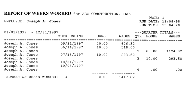 This is a listing of the pay each week between any two dates for an employee. It is useful for unemployment claims as it shows the totals per quarter and shows any weeks of work that were missed.