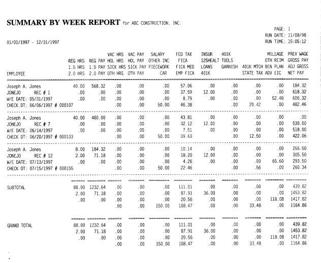This report can be printed for one or all employees for any range of dates. It shows all of their earnings and deductions for each week.