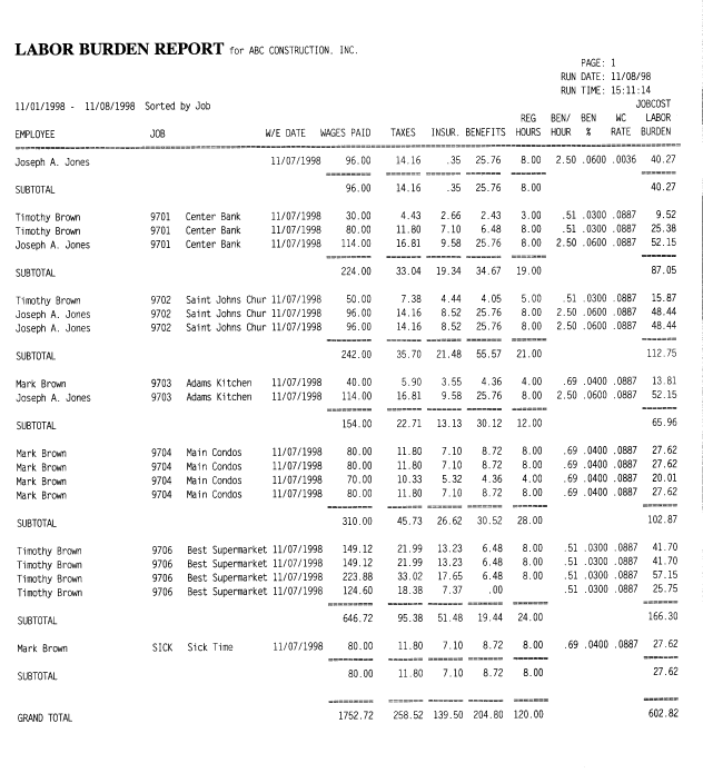 This report can be printed for any range of dates for one or all employees, and one or all jobs. It can be sorted by date, employee or job and shows the detailed breakdown of labor overhead.