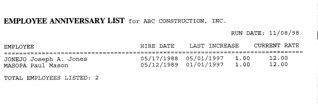 PRINT EMPLOYEE ANNIVERSARY LIST