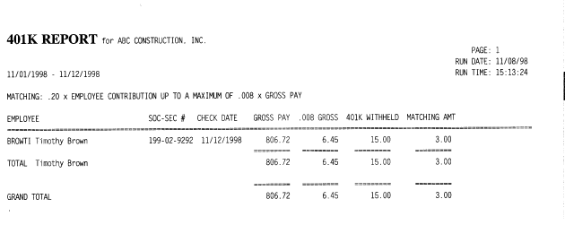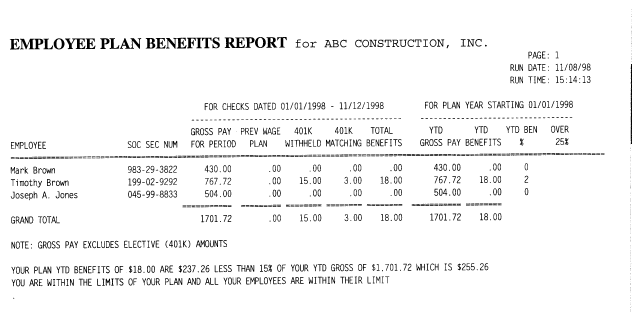 You may choose to print just a 401(k) report showing matching amounts (if any) or a report that shows 401(k) amounts along with prevailing wage plan amounts to send to your plan administrator.