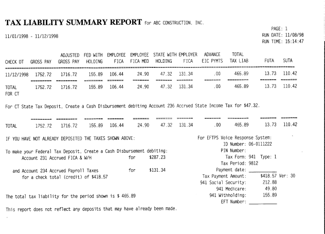 This report is used by monthly depositors to create tax deposit checks or EFTPS entries for the month. It shows the liability each week for all taxes. You may choose to print tax checks as well. This report can be printed for any range of check dates. It is also used if you do multiple payroll check runs in the same week and want to generate a tax check for the total.