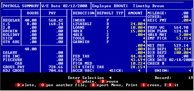 If you want to look at an employee’s check even after it has been printed and/or posted, you can go to the payroll summary screens directly. This is an example of a payroll summary record that has already been posted to the General Ledger. It is the same as unposted screens except in color and what information can still be changed.