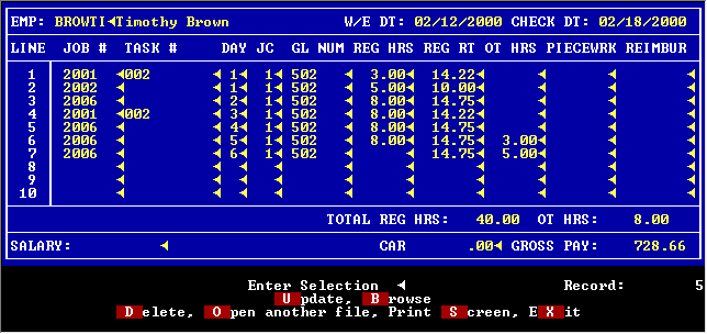 This is the time card screen. You will enter the job, task, day worked and job class and the system will automatically fill in the GL number and calculate the proper rate to be paid for this job and class for this employee. Benefits are calculated and worker’s comp rate is determined.