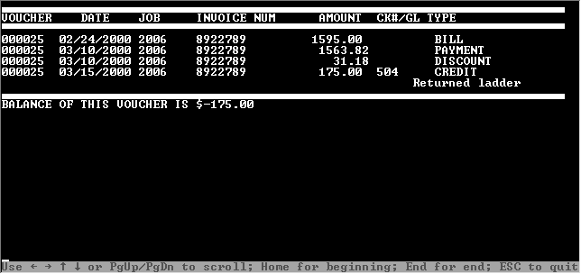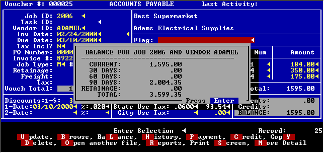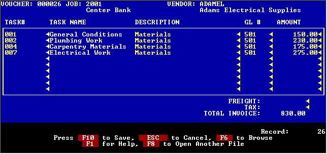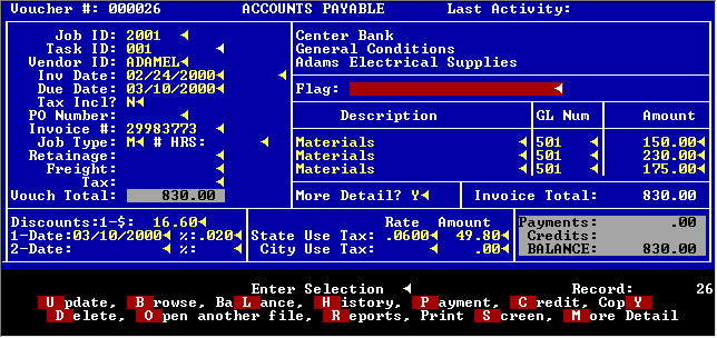 The Tax Included question is provided so that you can track sales tax paid if you choose. PO number may be entered and will link to TACT’s PO system if you are using it. TACT will warn you if you enter a duplicate invoice number for a vendor. You can also track subcontractor hours on the payable, if desired. The jobcost type determines where to put this cost in the jobcost system. The default is materials but you can choose to send this cost to subcontractors, service equipment or other costs. If you are withholding a portion of this invoice as retainage, you can enter it on this screen and the system will show it to you on your aged payables report. You will also be prompted as to whether or not you want to pay the retainage when paying bills by invoice. You can enter up to 10 GL distributions for each invoice - 3 on the first screen and an additional 7 on a second screen. You may also specify up to 10 tasks for each voucher. If you need to distribute one invoice to several jobs, you will use multiple voucher screens and the total for the invoice will be shown on each voucher screen. Freight and tax may be entered separately, if desired. A flag is available to mark this invoice to remind you while you are making payments by invoice. Invoices that are flagged are shown separately on the due date report as well. Any payments made or credits applied will show on this screen. The current balance of the invoice is always displayed. The last activity date is also shown. You can make a payment, apply a credit or use this invoice as a template to make a new AP entry.