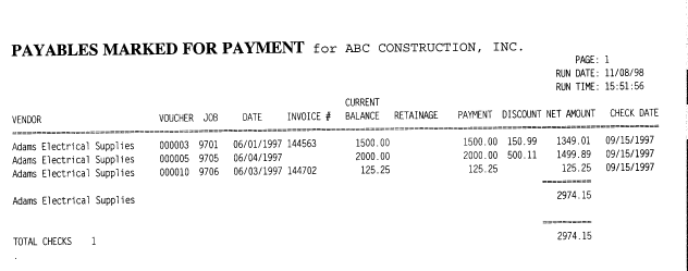 When using the “pay by invoice” method of payments, the payables are marked for payment before the actual checks are generated. If you have marked the payables but have not yet cut the checks, you can print this report to see the marked payables.