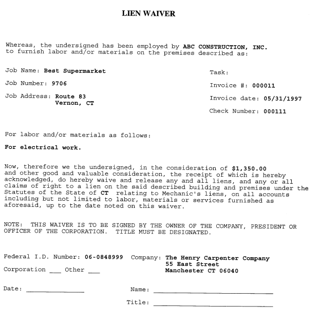 You can automatically print a lien waiver for a particular check paid to a vendor. The job, vendor and check information will print on the lien waiver automatically.