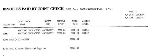 If you receive a joint check and apply it to payables, you can use this report to show you which invoices were credited by that check. Credits for joint checks are treated as receipts in jobcost.