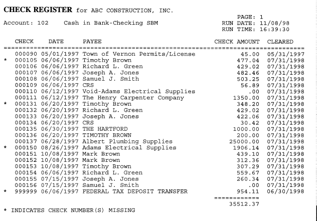 The Check Register may be printed for any range of dates or check numbers and can be sorted either by date or check numbers. If you sort it by check number, missing checks will be flagged.