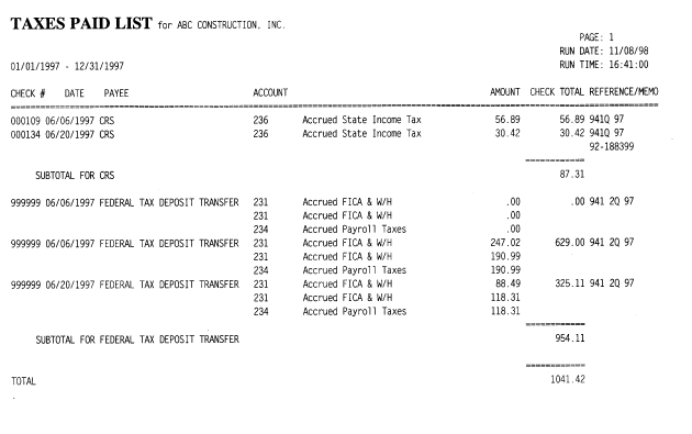 This report lists all disbursements against your default tax accounts (federal and state) to help in verifying the tax deposits you made between any two dates.