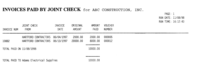 If you receive a joint check and apply it to payables, you can use this report to show you which invoices were credited by that check. Credits for joint checks are treated as receipts in jobcost.
