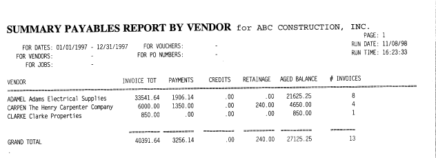 This report can be selected for any range of dates, vendors, jobs, purchase orders or vouchers and will show one line with the total payables per vendor.