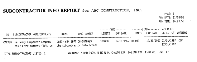 This report will print the subcontractor information (1099 numbers, policy expiration dates) stored in the vendor file.