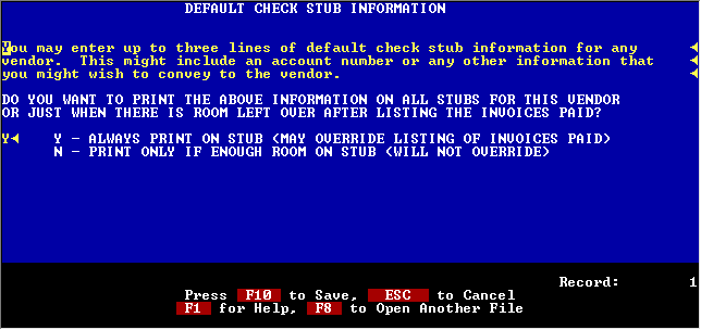 If you want to put some particular wording on the check stub for this vendor you can enter it on this screen. This feature comes in handy for garnishment checks where you have to name the employee and case number, etc.