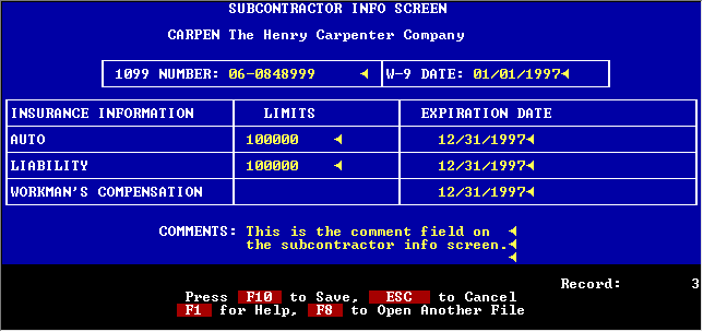 This screen appears for subcontractors. You can track the expiration dates for several policies if desired. When a policy comes within 30 days of expiration or expires, you will be warned while entering the invoice for this subcontractor.
