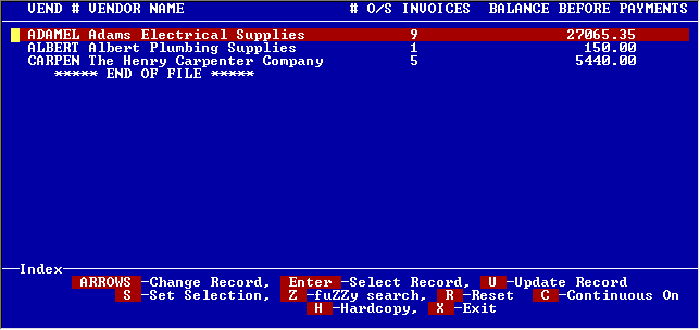 With this selection you are first shown a list of all the vendors to whom you owe money showing the number of outstanding invoices and the total balance for each vendor. When you select a vendor to pay, this screen appears, showing all the outstanding invoices for that vendor. You simply check off which ones you want to pay. The total check amount is shown at the bottom.