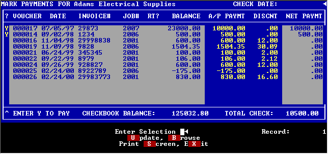 The invoices can be listed in job, date, vendor invoice or voucher number order for easy selection. A running balance of your checkbook may be shown if you wish.