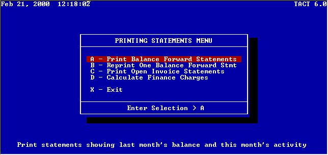 TACT provides two kinds of statements for your convenience. You may choose to charge interest or not by each customer. Finance charges are not automatically booked unless you make the selection to do so.