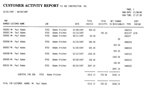 This report can be printed for any range of dates, customers and jobs and prints a separate page for each customer showing all the activity between the dates entered.