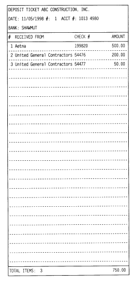 This selection prints a deposit slip for any day for any account showing customer checks and amounts.