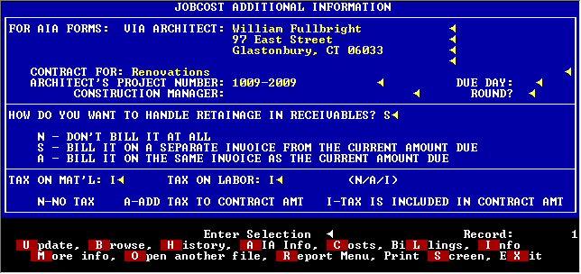 This screen asks you for the architect information for the AIA billing. You also will need to tell the system how you want it to handle retainage. If you choose not to bill retainage, the system will track the retainage amount as unbilled retainage. If you choose to bill it, you can either have it included with the current payment due invoice or have two invoices generated, one for current payment due and the other for the retainage amount.