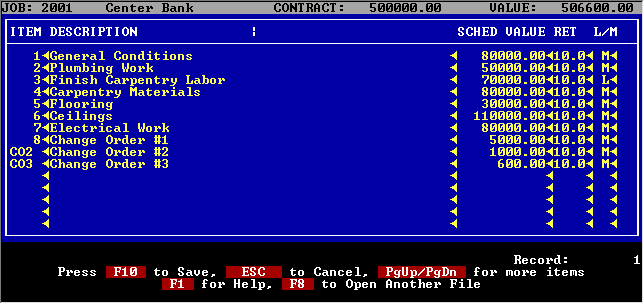 This screen is where you set up the schedule of values. Item numbers are alphanumeric. The L/M column is for separating labor and material items for taxing purposes if necessary. You can have up to 998 items on an AIA bill.