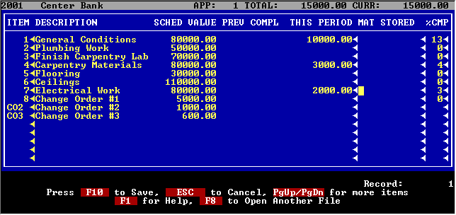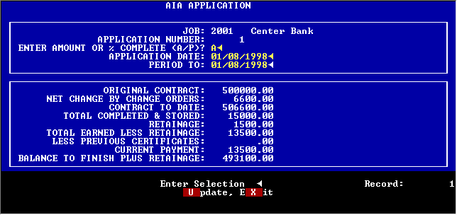 When you start a new application, TACT knows the next application number. You can choose to bill by amount or percent complete. If you choose to enter amount complete, you can also enter an amount for materials stored.