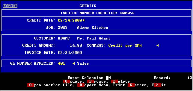 Credits that you issue to customers through the C selection in A/R Activity are stored in the credits file. You can view them at any time and change the date or GL number up until they are posted to the General Ledger. You may also delete any credits that are not posted to the General Ledger and the A/R will be adjusted accordingly.
