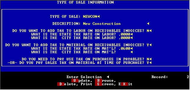 The Type of Sale File is used to define your sales and use tax rules. You can have as many combinations of state and city taxes by type of work. If you also have county tax in your area, it can be combined with the state or city tax, depending on to whom it is paid.