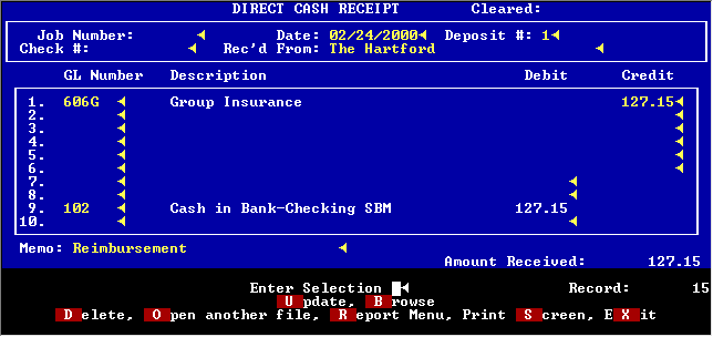 If you receive money that is not related to a bill you sent, you can enter a direct cash receipt. Use this screen for interest earned also.