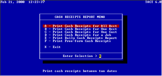 Cash Receipts reports can be printed from either the Receivables Report menu or the Cash Reports menu for your convenience.