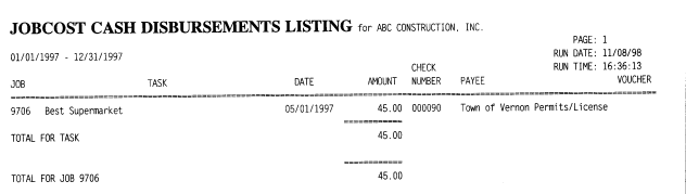 This report shows direct disbursements charged to one or all jobs between two dates.