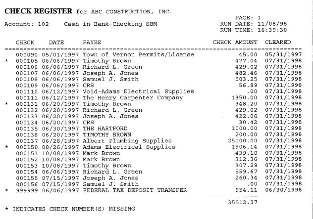 The Check Register may be printed for any range of dates or check numbers and can be sorted either by date or check numbers. If you sort it by check number, missing checks will be flagged.
