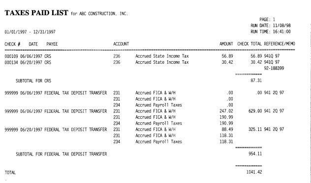 This report lists all disbursements against your default tax accounts (federal and state) to help in verifying the tax deposits you made between any two dates.