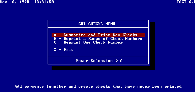 This menu is used for printing payables and cash disbursement checks no matter what method was used to create the checks.