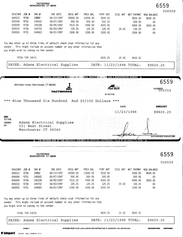 This selection will add up all outstanding cash disbursements by vendor and cut one check per vendor. Stub information for payables check includes previous balance and new balance. Check stub information can be printed from the vendor file. A message may be added to the stub of all checks at print time.