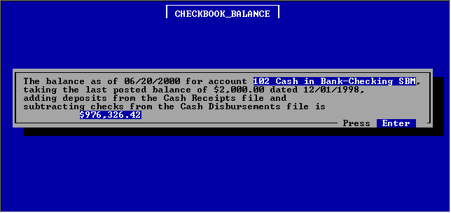 DISPLAY CURRENT CHECKBOOK BALANCE