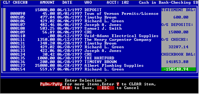 This selection will prompt you for the cash account you wish to reconcile, the bank statement date and balance. It will then select all the outstanding checks and deposits for that account and show them on the screen for you to clear them.