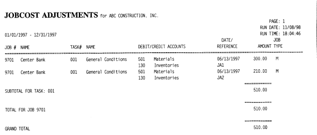 This report lists all Jobcost Adjustment entries for and range of dates and a selection of job numbers.
