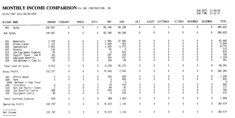 This selection prints a report for any 12 months of posted data showing the income statement for each month.