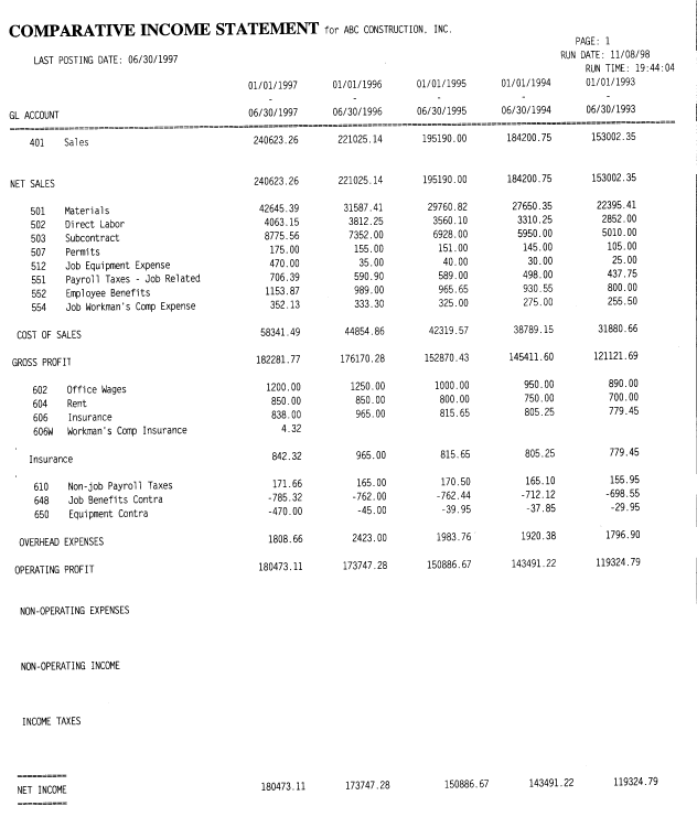 This selection allows you to name any five starting and ending dates and prints the income statements for those periods. This report combines both posted and unposted data.