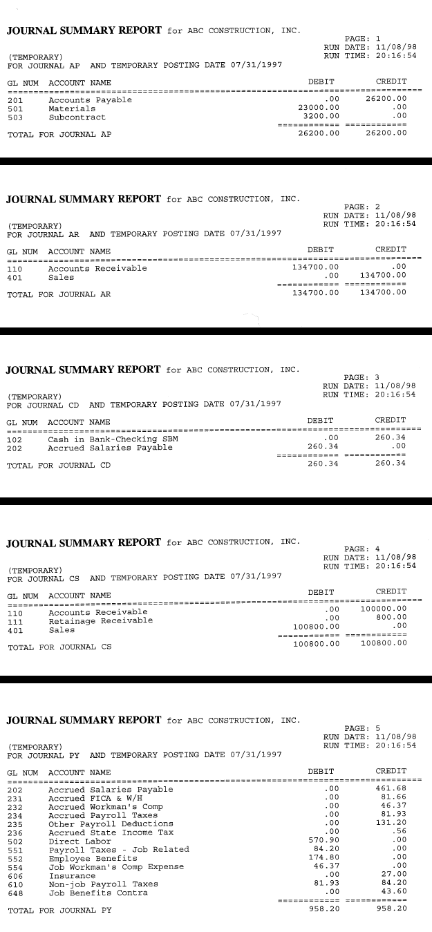 This report shows the total debits and credits for each GL number in each temporary journal.