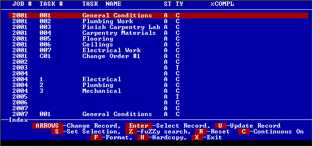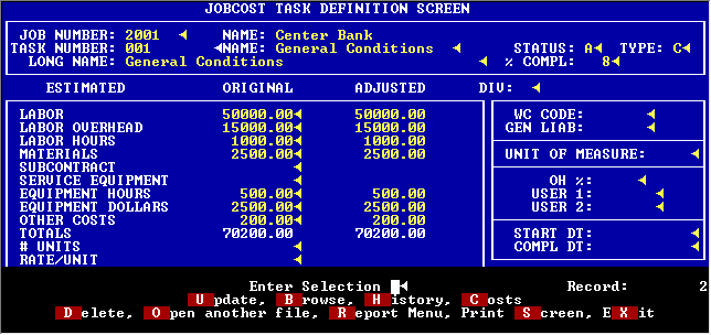 Jobs may be further broken down into tasks. When you set up a job you may have the tasks automatically generated for you or you may enter them separately. Each task holds its own set of estimates and costs.