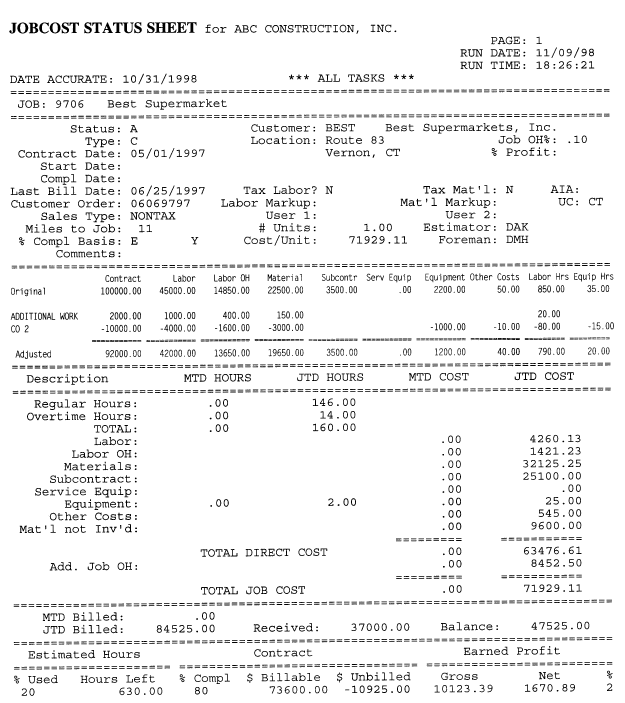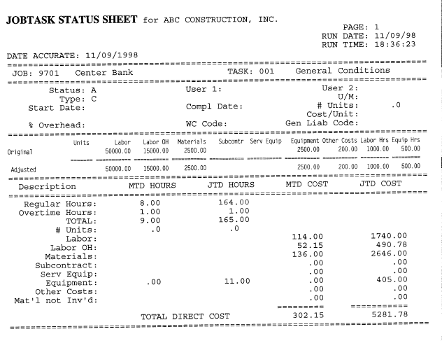 This selections allows you to print a full-page form for any job or tasks showing all administrative information, estimates, change orders and costs for the month and job-to-date.