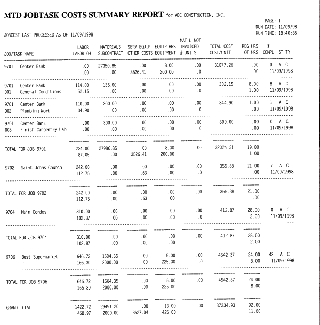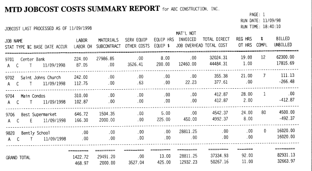This report lists the costs for the month for only those jobs that had costs. You may also ask for this report for only jobs that had costs but no billing in the month.